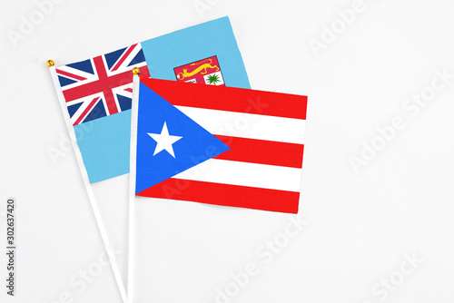 Puerto Rico and Fiji stick flags on white background. High quality fabric, miniature national flag. Peaceful global concept.White floor for copy space.