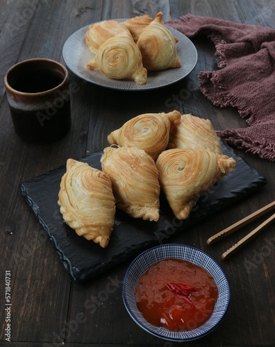 puffs filled with curry vegetables served on a wooden table