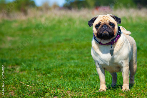 Pug dog stands on green grass.