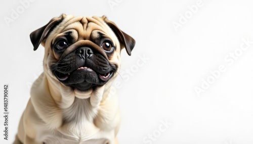 Pug with endearing expression, isolated white backdrop Close-up shot , expression, face, eyes