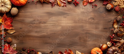 Pumpkin Autumn Vegetables With Colorful Leaves Acorns Nuts Berries On Wooden Rustic Table Flat Lay With Space For Text Fall Seasons Greeting Card Happy Thanksgiving Hello Autumn