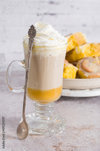 pumpkin cinnabons and latte for dessert, holiday table with pastries, home sweet