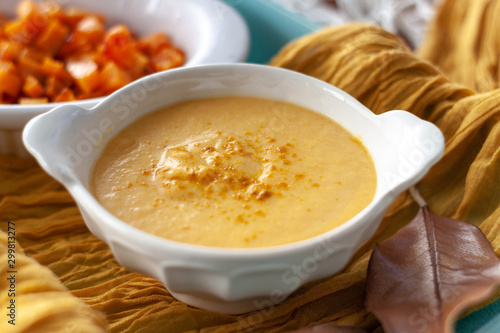 Pumpkin cream spiced with curry in a white bowl with roasted pumpkin and bread. Close Up