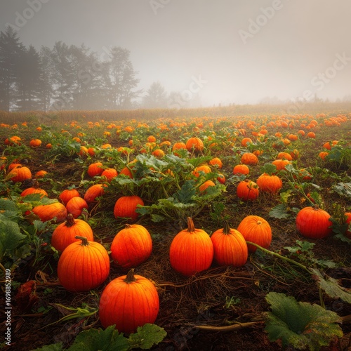 pumpkin, farm, field, autumn, fall, orange, vegetable, agriculture, harvest, farming, crop, seasonal, gourd, plant, leaf, fog, mist, light, soft, diffused, nature, landscape, tree, ground, dirtied, many, fresh, ripe, colours, copy space, foliage, vibrant, farmland, background, natural, scenic, food