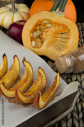 Pumpkin slices baked with cinnamon and sugar. Thanksgiving dinner. Fall harvest. Fall festival.