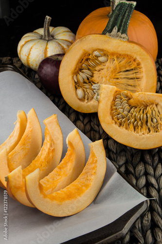 Pumpkin slices baked with cinnamon and sugar. Thanksgiving dinner. Fall harvest. Fall festival.