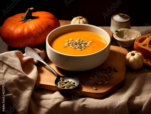 Pumpkin soup in a white bowl on a wooden board.AI Generated