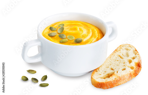 Pumpkin soup in white bowl on a white isolated background