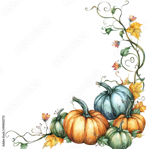Pumpkin Vine with Falling Leaves Isolated on Transparent Background, Boho Halloween Decor