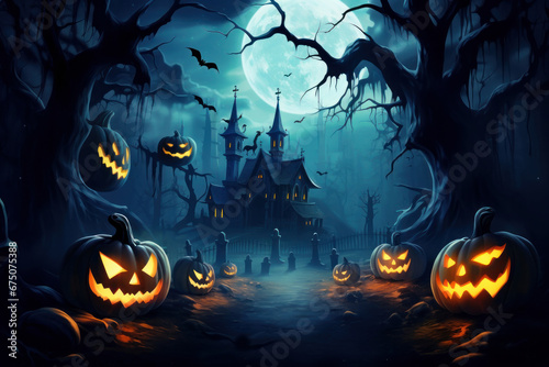 Pumpkins, a haunted castle, and tombstones in a spooky graveyard. Moonlit Halloween night with an air of mystery. AI Generative creates the magic.