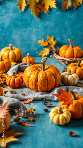 pumpkin, fall, autumn, leaf, blue, background, yellow, brown, still, life, nature, harvest, season, thanksgiving, decoration, rustic, cosy, vibrant, colourful, gourd, squash, stem, seed, seasonal, october, november, foliage, maple, leaf, holiday, centrepiece, food, vegetable, autumn, patch, decor, halloween, natural, time, colours, organic, festival, element, vintage, country, vibe, beauty, ambience
