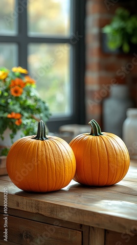 Pumpkins and flowers as fall home decor in modern kitchen setting