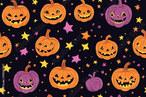 Pumpkins and stars, neon colors on a black background pattern. High quality