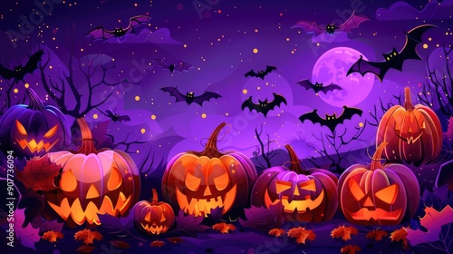 Pumpkins, bats and autumn leaves on a purple background. Festive background in honor of Halloween.