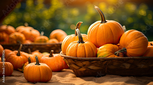 pumpkins in a basket in the counter of a blurred backround of a street market