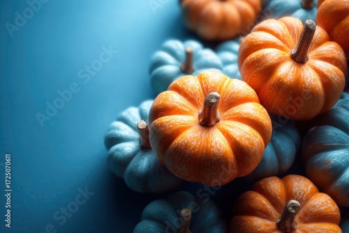 pumpkin, orange, blue, flocked, fall, autumn, still, life, harvest, gourd, decorative, seasonal, thanksgiving, halloween, tabletop, arrangement, ripened, vegetable, colourful, texture, pattern, surface, light, shadow, background, holiday, decoration, october, november, squash, cucurbit, cucurbitaceae, food, festive, ornate, vibrant, pastel, muted, studio, shot, photo, botanical, closeup, minimal, simple, elegant, modern, stylised