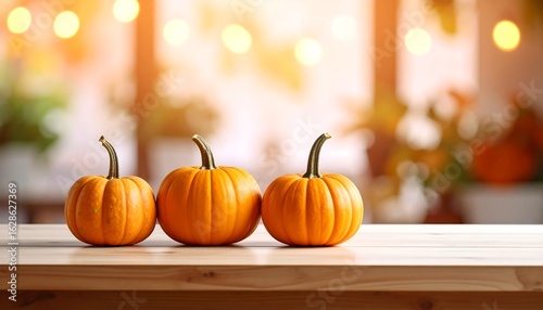 pumpkin, autumn, fall, thanksgiving, halloween, gourd, orange, wooden, table, display, decor, harvest, nature, seasonal, home, autumn, cosy, warm, light, blurred, background