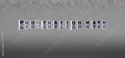 punctuation mark word or concept represented by black and white letter cubes on a grey horizon background stretching to infinity