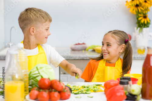 family, breakfast, eating, food, children, children, apron, boy, brother, childhood, cook, cooking, cucumber, diet, dinner, fresh, friends, fun, funny, girl, happiness, happy, having, health, healthy, holding, home, indoor, joy, kitchen, little, lunch, meal, nourishment, people, preparation, prepare, raw, salad, sibling, sister, smile, table, together, tomatoes, vegan, vegetable, vegetarian, vitamin, young