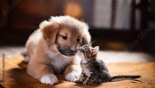 puppy licking a kitten in a playful moment of friendship