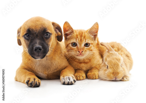 rabbit, puppy, kitten, animal, dog, cat, cat, rabbit, pet, isolated, white, group, studio, young, cute, domestic, background, canino, baby, together, small, friendship, red, funny, sitting, beautiful, three, love, mammal, care, humor, pedigreed, family, nature, farm, companion, team, life, veterinary, watching, happy, hare