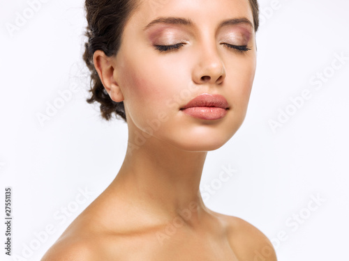 woman, human face, beauty, beautiful, portrait, young adult, closeup, make-up, isolated, white, brown hair, caucasian, one person, studio shot, sensuality, smiling, closed eyes