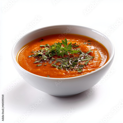 pureed tomato soup, front view, photo in a slight angle, centered and isolated on a white background with no shadows.