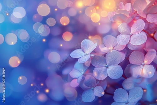 Purple and blue gradient background with pastel flowers, light pink and purple blurred background, white petals of hydrangea flower.