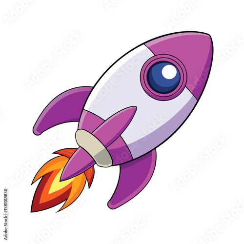 Purple and white rocket blasting off with orange flames spaceship space