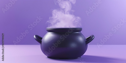 Purple cauldron with rising steam on purple background