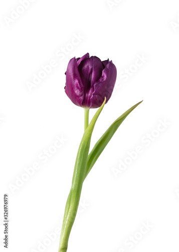 Purple. Close up of beautiful fresh tulip isolated on white background. Copyspace for your ad. Organic, flower, spring mood, tender and deep colors of petals and leaves. Magnificent and glorious.