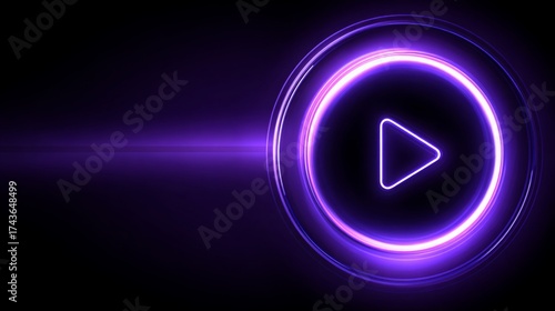 purple color play button on black background. Start button. Neon glowing play button. Neon glowing play button with neon circle.