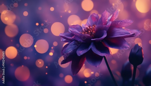 Purple flower with bokeh lights in background creating a dreamy soft effect.