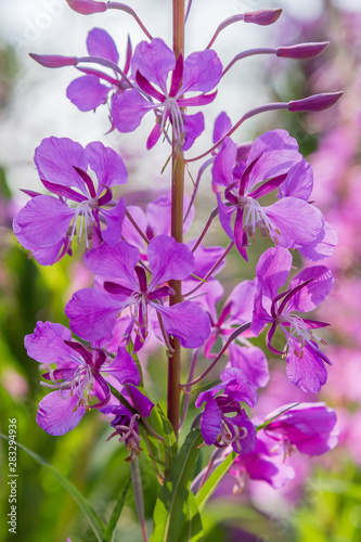 Purple flowers of fireweed, Rosebay Willowherb, Epilobium angustifolium, French willow, Ivan-tea in natural background, healthy tea, traditional medicine. Floral background.