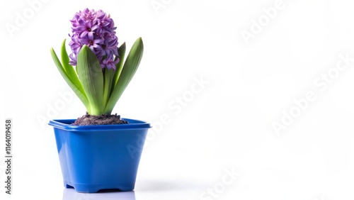 Purple Hyacinth Flower in Blue Pot, Spring Blooming Bulb Plant, Isolated White Background