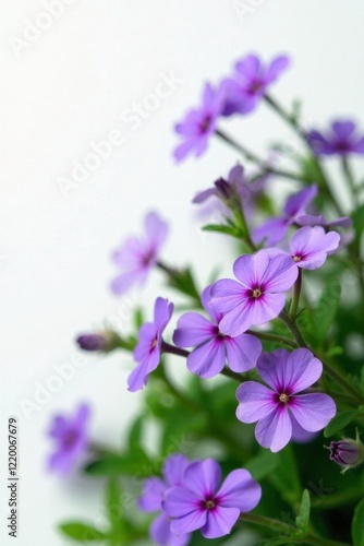 Purple periwinkle stems with small flowers in a clean white environment, periwinkle, foliage
