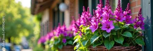 Purple Salvia Splendens blooms in a hanging basket with trailing stems, plants in baskets,