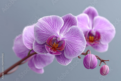 orchid, purple, flower, flower petals, stem, striped, grey background, bud, floral, closeup