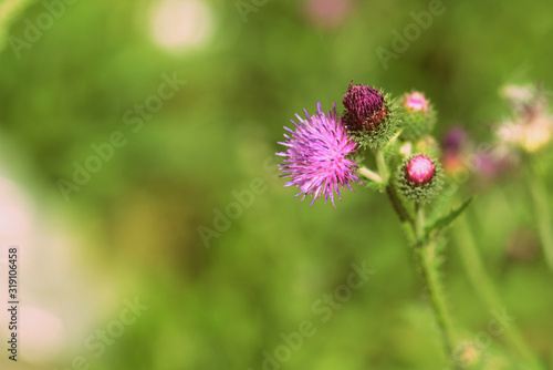 Purple thistle flowers on a summer meadow close-up. Retro style toned