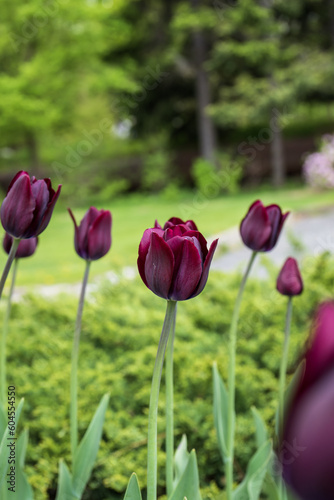 purple tulips in a flower bed