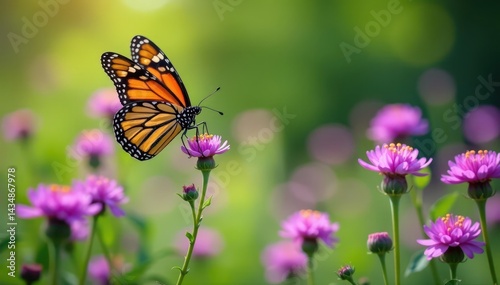 Purple wildflowers, monarch butterfly in flight, summer, insect