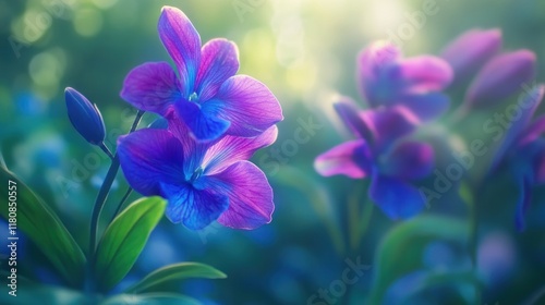 Purple-blue orchids blooming, garden sunlight, bokeh background, floral design