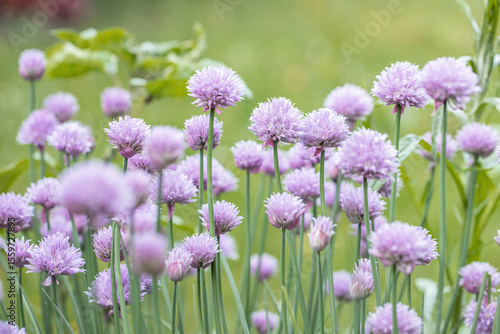 Purple-pink flowers of chives (Allium schoenoprasum).