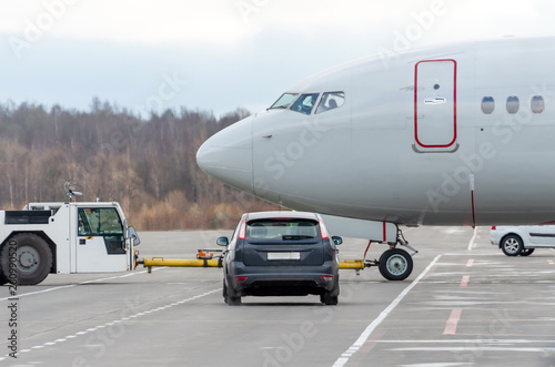 Push back tow tractor aircraft. Airfield services in the car waiting to miss the plane at the intersection.