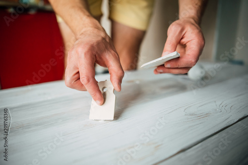 Putty in the hand of a person. Removing paint from the surface of the tree. Preparation of boards before impregnation with varnish. Application of putty.