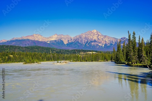 Pyramid mountain looms over this panoramic view of the fast flowing Athabasca river near Jasper in the Canada rockies