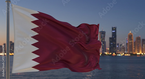 flag, qatar, doha, city, skyline, dusk, evening, middle east, country, national, symbol, waving, breeze, architecture, building, skyscraper, waterfront, persian gulf, patriotic, pride, identity, travel, tour tourism, landmark, iconic, capital city, modern, urban, vibrant, illuminated, dark sky, politic, nation, arab, asia