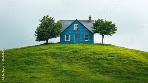 house, home, blue, hill, green, grass, landscape, nature, bungalow, countryside, idylli, peaceful, charming, exterior, property, vacation, dream, summer, spring, rural, modern, rustic, cabin, simple, cosy, travel, relaxing, minimalist, garden, tree, design, pretty, stylish, vintage, investment