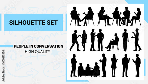 people, conversation, talking, silhouette, chat, speech, dialogue, group, team, meeting, work, office, discussion, man, woman, face, profile, standing, sitting, corporate, together, talk, brainstorm, idea, business, friends, man, woman, figure, illustration, teamwork, collaboration, partner, colleague, interaction, speak, chatting, interview, networking, silhouette, community, communication, crowd, social, staff, leader