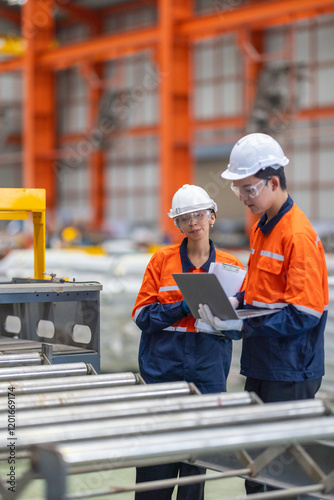 asian, collaboration, documentation, efficiency, equipment, factory, female, gear, helmet, industrial, inspection, laptop, line, logistic, male, management, manufacturing, metal, metalwork, operation, planning, precision, production, professional, protective, quality, safety, sheet, strategy, supervision, teamwork, technology, workplace